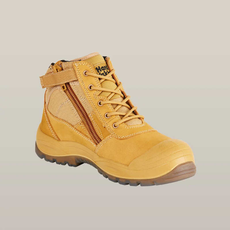 The Hard Yakka Utility Zip Sided Steel Toe Safety Boots Zip Sided Safety Boot offers dependable protection and comfort. Built with a wide profile steel toe and extra-wide fit, it provides excellent room and comfort for various foot sizes. The quick release side zip ensures easy on/off convenience. The water‑resistant nylon and leather upper deliver durability in tough conditions.