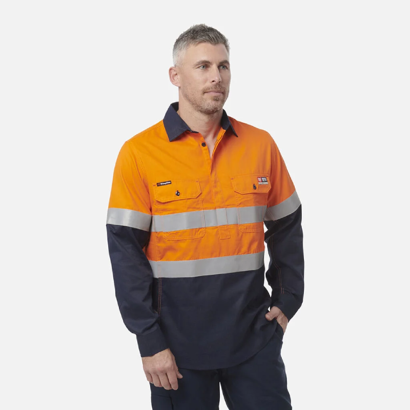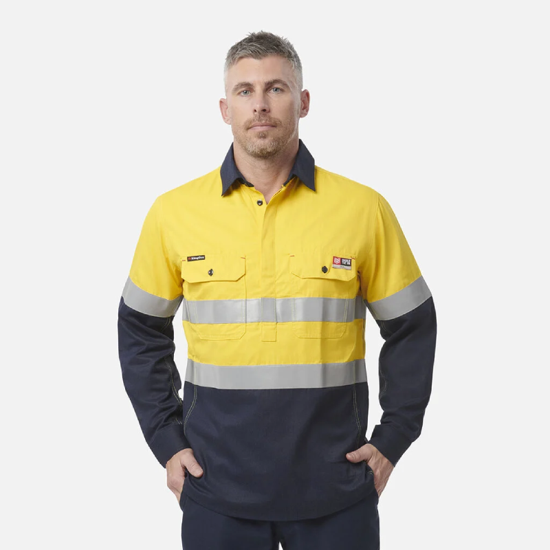King Gee Shieldtec Flame Retardant Hi-Visibilty Two Tone Closed Front Long Sleeve Shirt With Fr Tape Flame Resistant