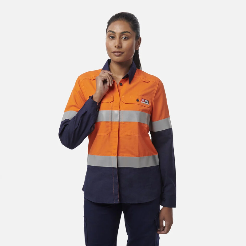 King Gee Women's Shieldtec Lenzing Flame Retardant Hi-Vis Fire Resistant Spliced Open Front Taped Shirt